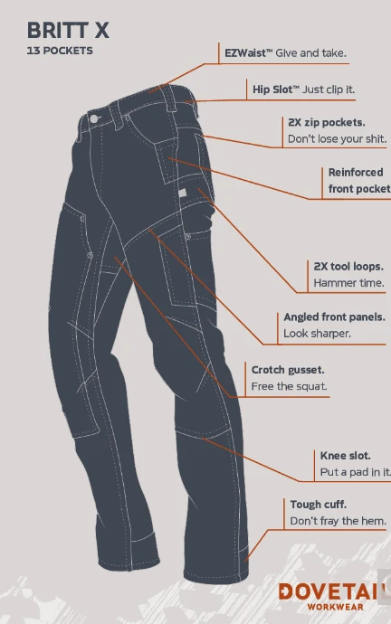 Fans of Britt Utility, what’s with the X in Britt X? It’s just a bit Xtra. Xtra deep pockets. Xtra zip pockets. Xtra hammer loop. Xtra comfort with an EZWaist. Here’s an Xtra sentence with Xtra. Yes, we’ll stop now because it’s Xtra annoying. XO