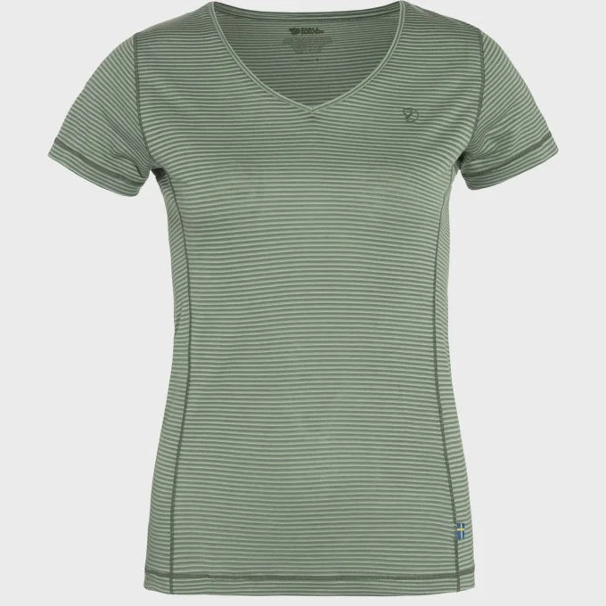 Short-sleeved t-shirt with an attractive fit and V-neck. Just as comfortable when trekking as when travelling in warm climates. Made from pliant functional material with lyocell and organic cotton that wicks away moisture and gives a comfortable feel against the skin. Attractive pattern with thin stripes in similar nuances. Flat lock seams prevent chafing.