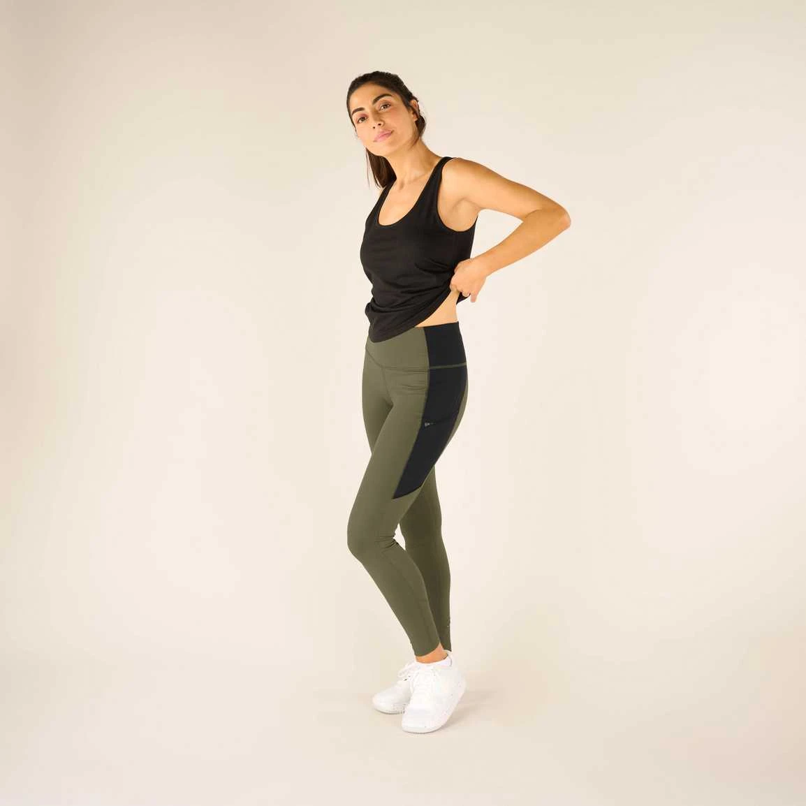 - Wide waistband for smooth fit under layers and hidden interior waistband key pocket